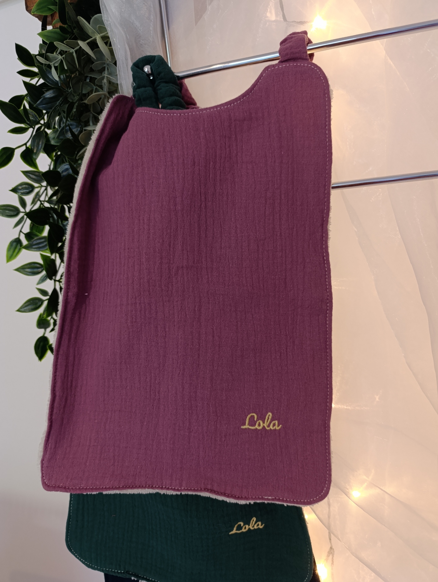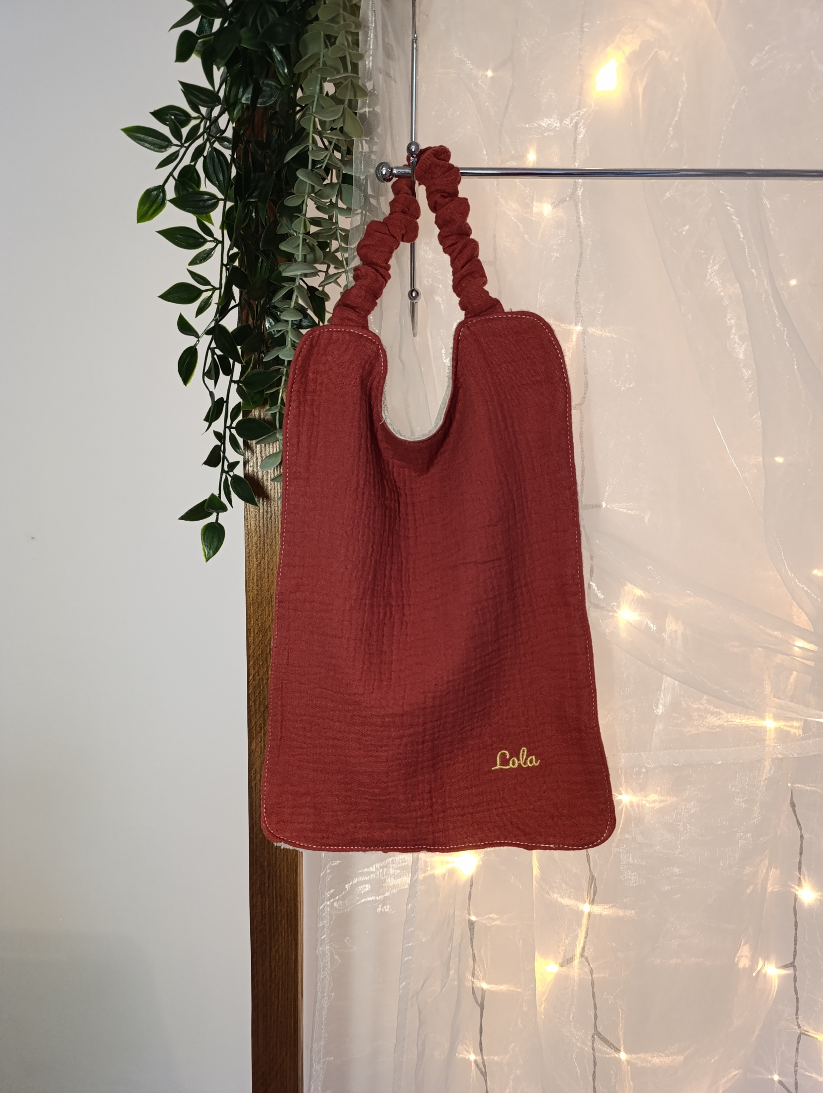 Bavoir deuxième âge, composé d’un tissu sur l’avant et d’un tissu éponge sur l’arrière, avec un tour de cou élastiqué pour faciliter l’enfilage et le retrait.