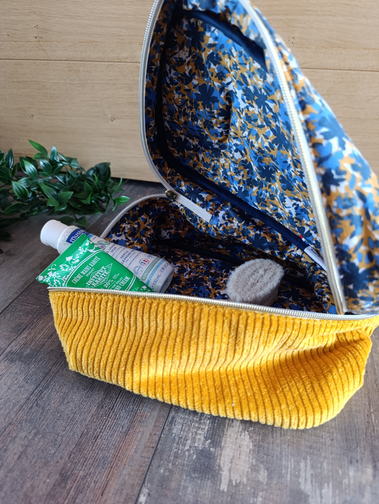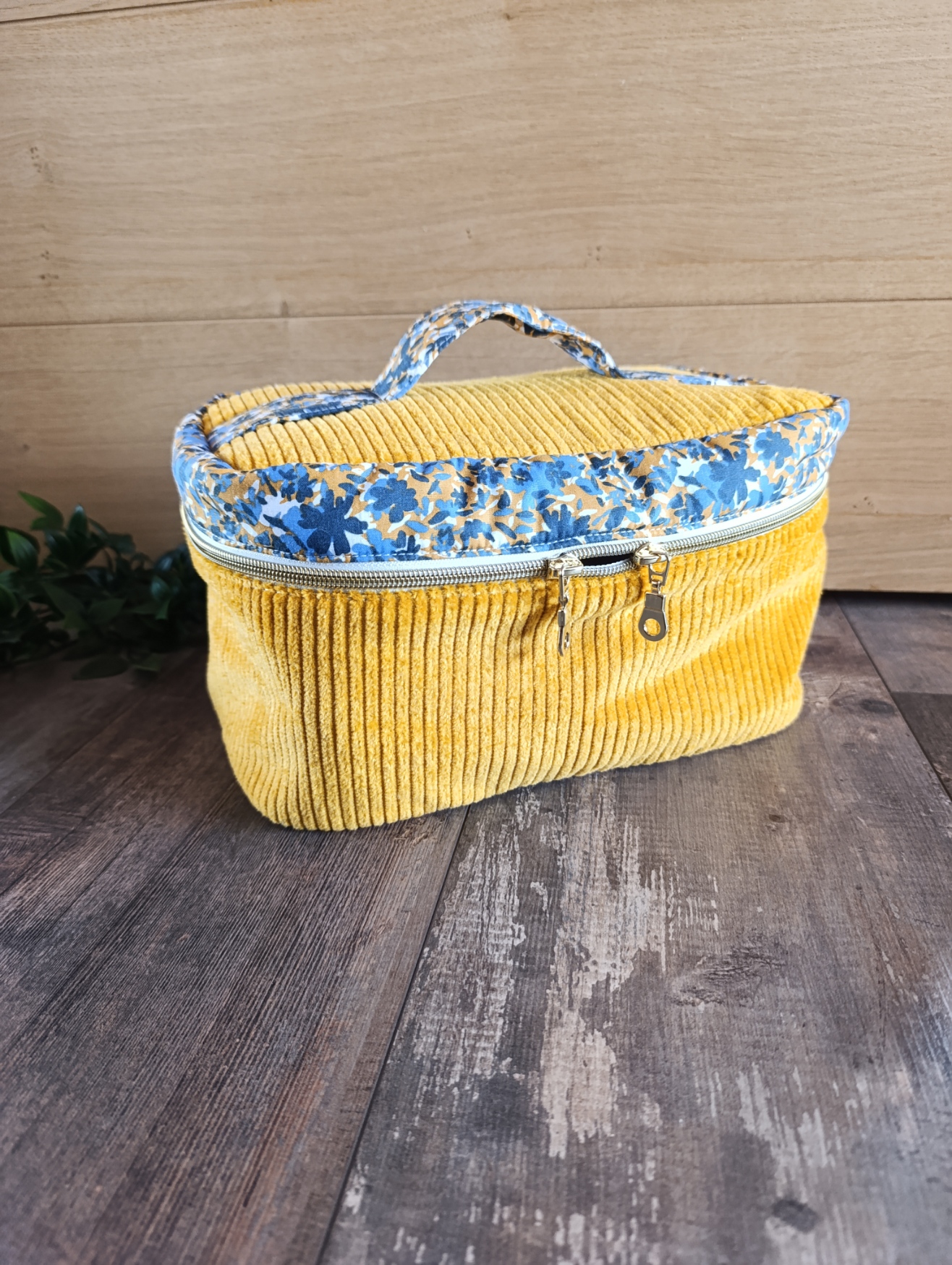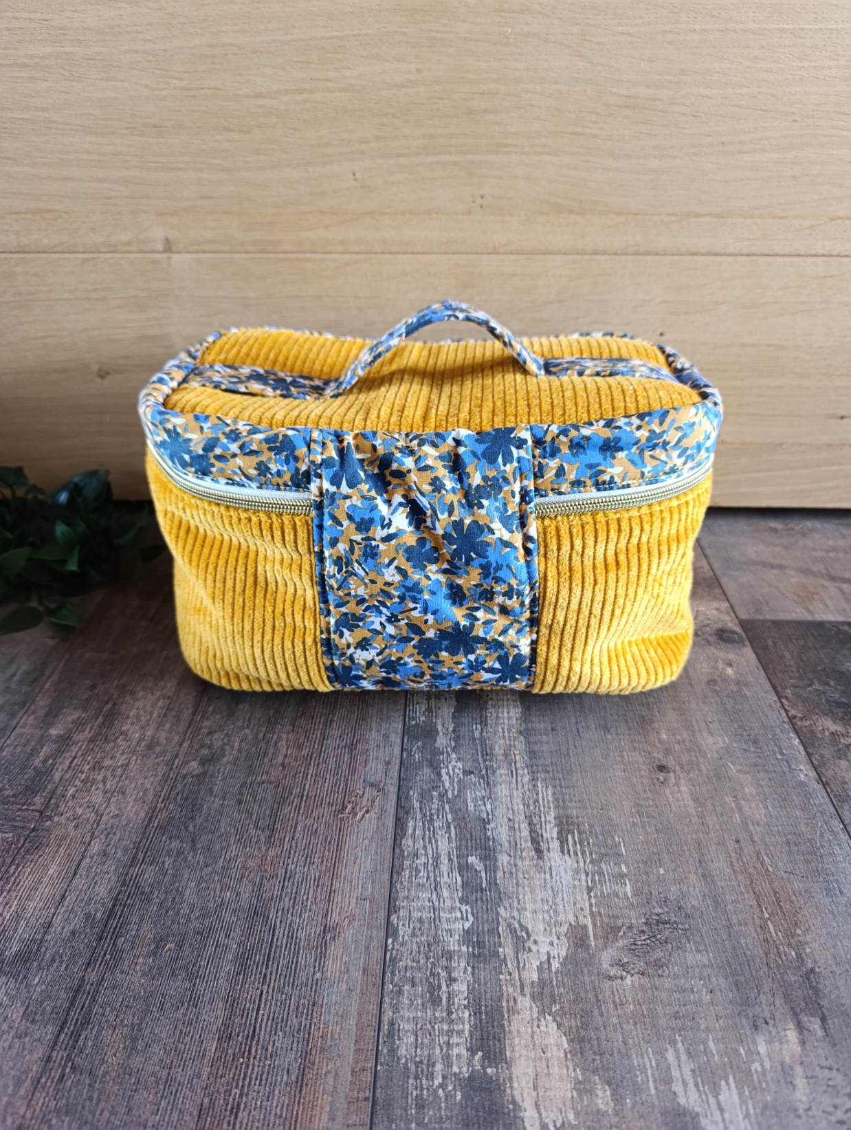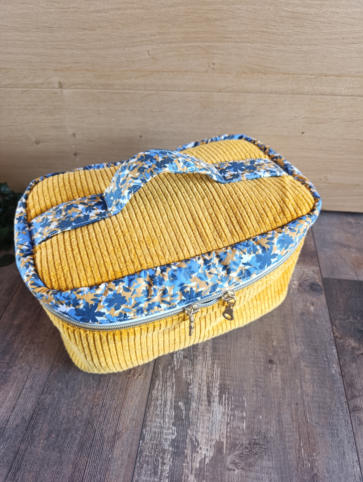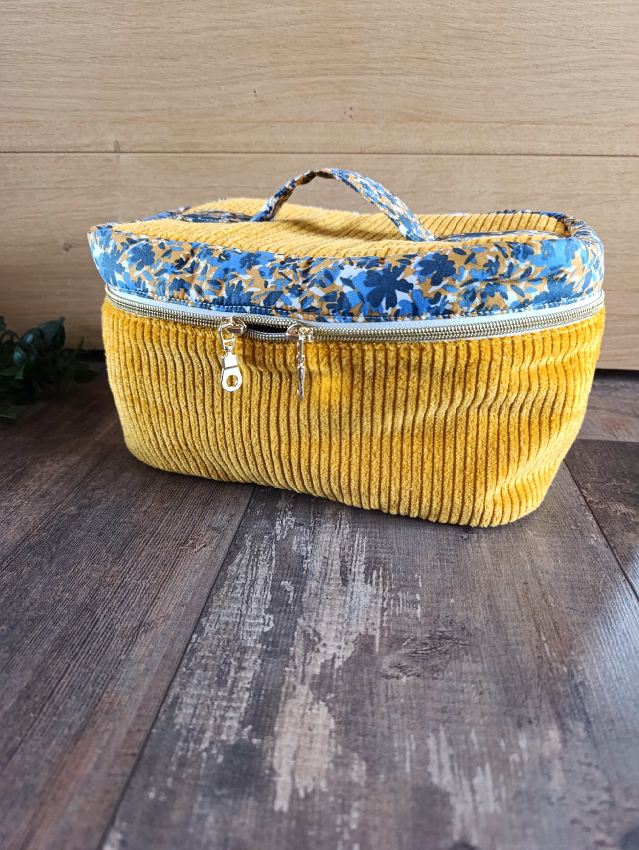 Vanity moutarde, intérieur moutarde et marine à motifs floraux.